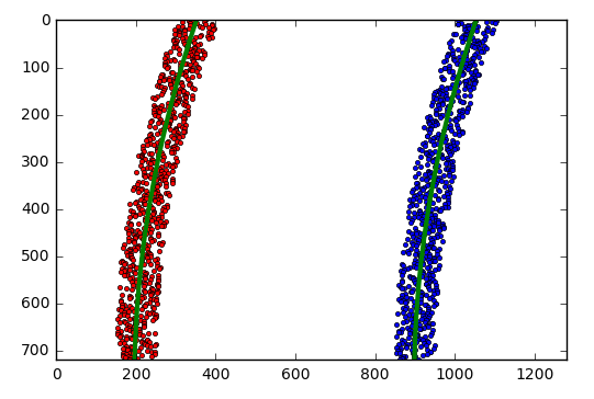 Here I have fit the left and right lines with a second order polynomial shown in green.
