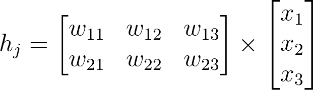 In this case, we're multiplying the inputs (a row vector here) by the weights. To do this, you take the dot (inner) product of the inputs with each column in the weights matrix. For example, to calculate the input to the first hidden unit, j = 1 , you'd take the dot product of the inputs with the first column of the weights matrix, like so: