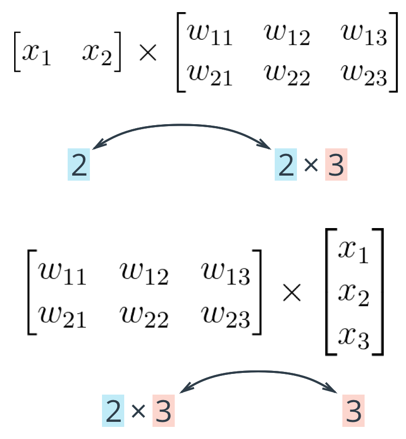 The important thing with matrix multiplication is that the dimensions match . For matrix multiplication to work, there has to be the same number of elements in the dot products. In the first example, there are three columns in the input vector, and three rows in the weights matrix. In the second example, there are three columns in the weights matrix and three rows in the input vector. If the dimensions don't match, you'll get this: