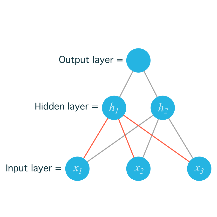 For example, the following image shows our network, with its input units labeled x_1, x_2, and x_3 , and its hidden nodes labeled h_1 and h_2 :
