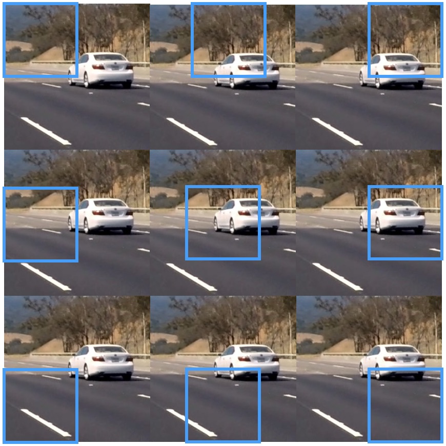 In the last exercise, you saw how the number of windows scales with image size, window size, and overlap. In the project it will be useful to have a function to perform a sliding window search on an image, so let's write one! This will just be the first iteration, where you don't actually need to do anything besides plot a rectangle at each window position.