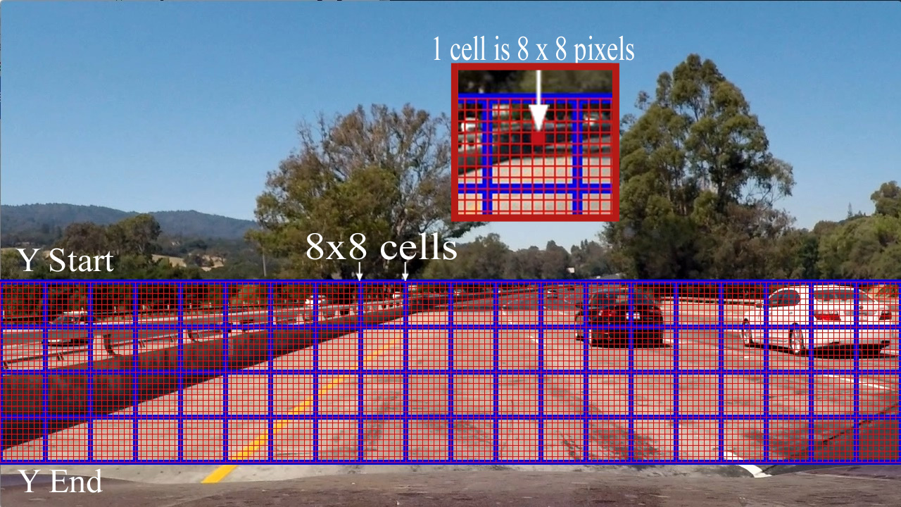 For our example are using a 64 x 64 base window. If we define pixels per cell as 8 x 8, then a scale of 1 would retain a window that's 8 x 8 cells (8 cells to cover 64 pixels in either direction). An overlap of each window can be defined in terms of the cell distance, using cells_per_step . This means that a cells_per_step = 2 would result in a search window overlap of 75% (2 is 25% of 8, so we move 25% each time, leaving 75% overlap with the previous window). Any value of scale that is larger or smaller than one will scale the base image accordingly, resulting in corresponding change in the number of cells per window. Its possible to run this same function multiple times for different scale values to generate multiple-scaled search windows.